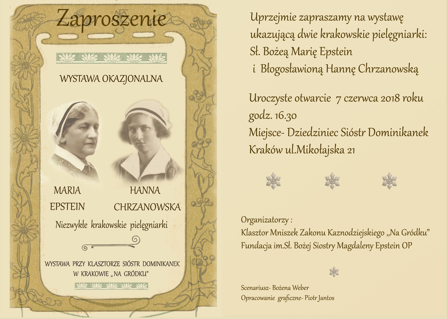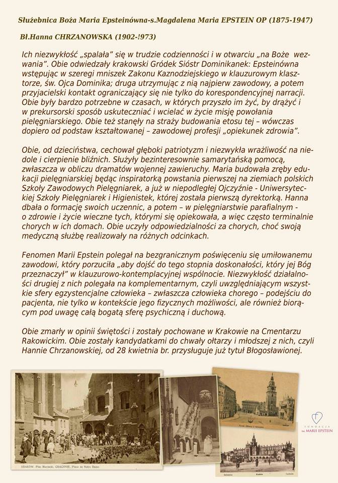 7 czerwca 2018 r. na dziedzińcu kościoła i klasztoru Sióstr Dominikanek Na Gródku otworzyliśmy okazjonalną wystawę poświęconą dwóm wspaniałym pielęgniarkom z Krakowa: Marii Epstein i Hannie Chrzanowskiej.